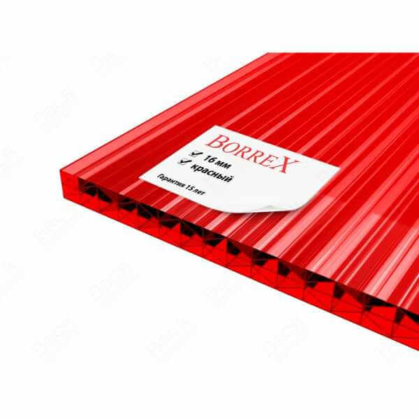 Сотовый поликарбонат 16 мм BORREX красного цвета размером 2100х12000 мм - это прочный и легкий материал, который отлично подходит для использования в различных строительных и дизайнерских проектах. Поликарбонат обладает высокой устойчивостью к ультрафиолетовому излучению, а также хорошей теплоизоляцией, что делает его идеальным выбором для крыш, навесов, ограждений и других конструкций.